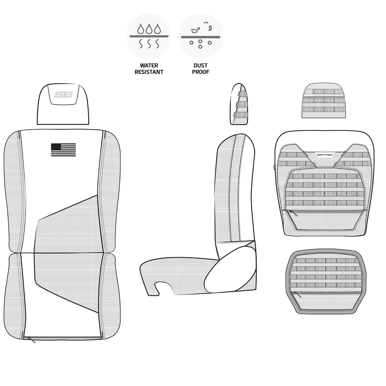 Compatibility: G.E.A.R Seat Covers are Air bag compatible. Removable rear MOLLE panel for vehicles equipped with or without factory MOLLE.